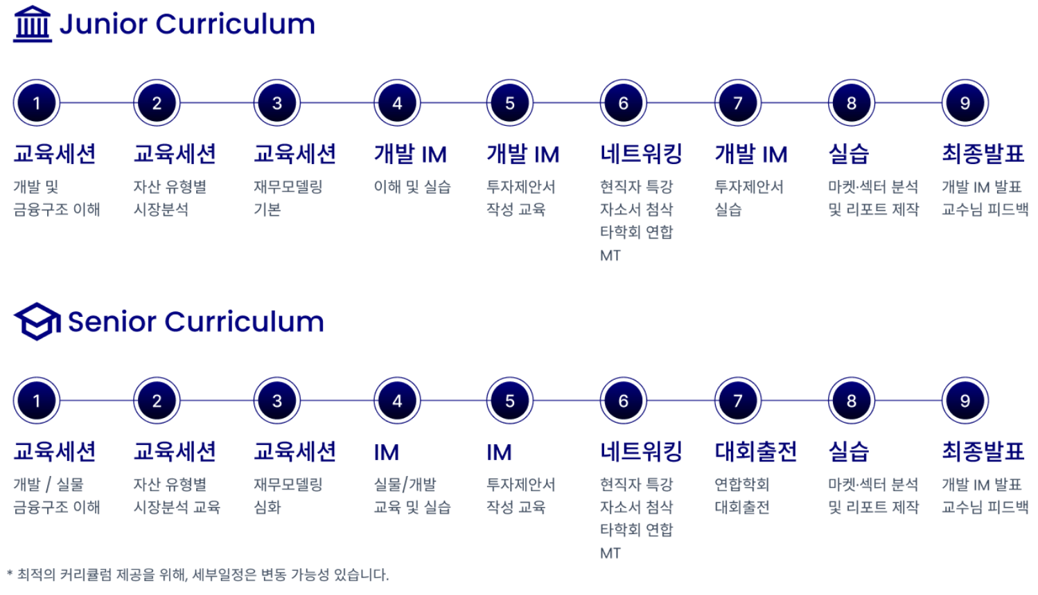 사업 부지를 선정하여 개발 프로젝트를 진행합니다. PF 대출 등을 통해 자금 조달, 개발 규제, 분양모델 수립 등을 파악하는 모의 IM을 작성합니다. 개발 IM 활동을 통해 개발 전반적 지식을 배우게 되며 실무에서 발생하는 다양하고 복잡한 부동산 개발에 대해 직접적으로 경험하게 됩니다.